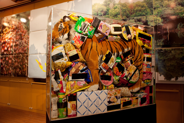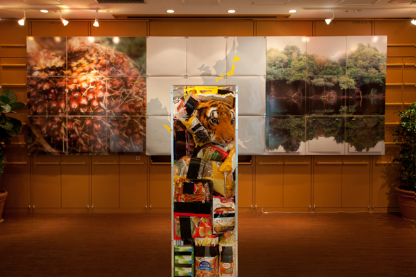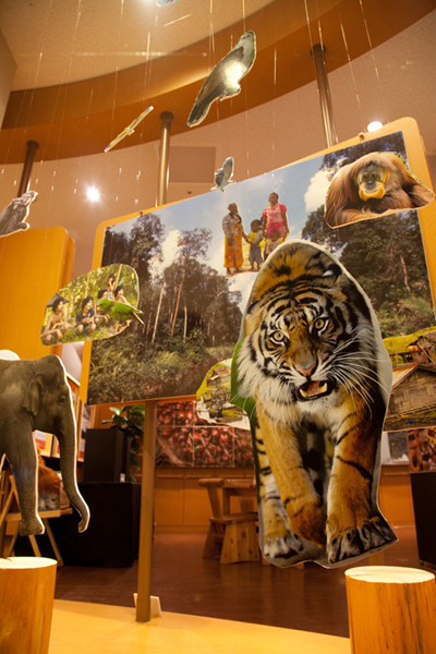 スマトラの泥炭湿地に依存する地域住民の暮らし、また現在も急速に破壊が進められている開発の現状を写真パネルや映像に加え、アブラヤシ農園の拡大とパルプ用産業植林造営のために生息地を失ったスマトラトラをモチーフとしたインスタレーションなど多くの創造的工夫を凝らして紹介しました。
