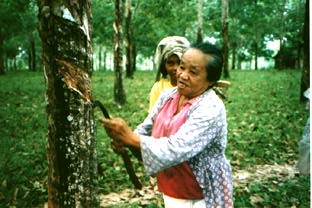 一方、この地域のゴム農園の一日の収穫はhaあたり25kg以上で、その収益は少なく見積もっても25,000ルピア/ha(約1400円)になる。ゴムは7年の間毎日採れ、日曜ごとに市場で売る。他の作物を同時に植えるのが一般的なやり方だが、基本的には7年ごとにローテーションで土地を休ませる。肥料は経済的に余裕がある時のみ買ってきて使うが、土地が肥沃なので基本的には必要ないという。産業造林以前に、1982年にSI社(Stanvac Indonesia)という石油会社により石油基地が村に建設された時は事前交渉があり、作物と土地の両方に対して補償金が出た。その他油やしプランテーション用の土地収用もあったが、それぞれに事前交渉があり、額は不均一だが補償金も出たという。