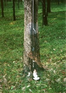 実際に造林地に入ってみると、90~91年から植えられたと思われるアカシアが、既に成長してかなりの高さになっている。時々、幹を削った部分に人の名前が記してある木が見られた。これはゴム園を奪われた村人が、その事実を残すためにつけたものだという。また、造林地の周囲にのみゴム園を残してアカシアを隠し、目につきにくくしている所も多く見られた。