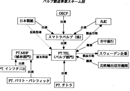 パルプ工場建設事業の実施会社は、日本・インドネシア合弁のタンジュン・エニム・レスタリ(TEL)社。所要資金は全体で約10億ドルで、日本側は「スマトラパルプ株式会社 (SPC社)」という投資会社を通じてOECF45億円、丸紅47億円、日本製紙8億円の計100億円を出資。また日本製紙はTEL社に対して技術援助を行い、丸紅はTEL社のパルプ製品を引き取って日本国内で販売することになる。なおSPC社役員は、代表取締役社長に丸紅から出向した大来氏、副社長にOECFを退職した高松氏が就任するなど、出資社・機関メンバーで構成されている。